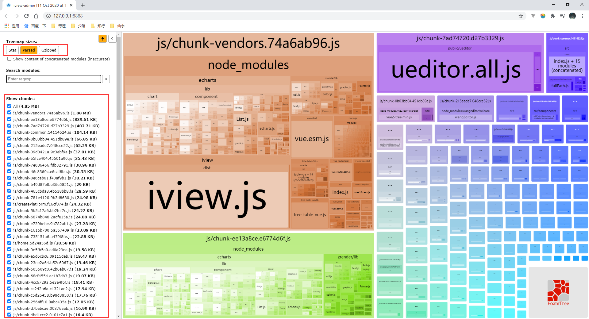 webpack-bundle-analyzer 可视化资源分析工具可以直观地分析打包出的文件有哪些,及它们的大小、占比情况、各文件 Gzipped 后的大小、模块包含关系、依赖项等。