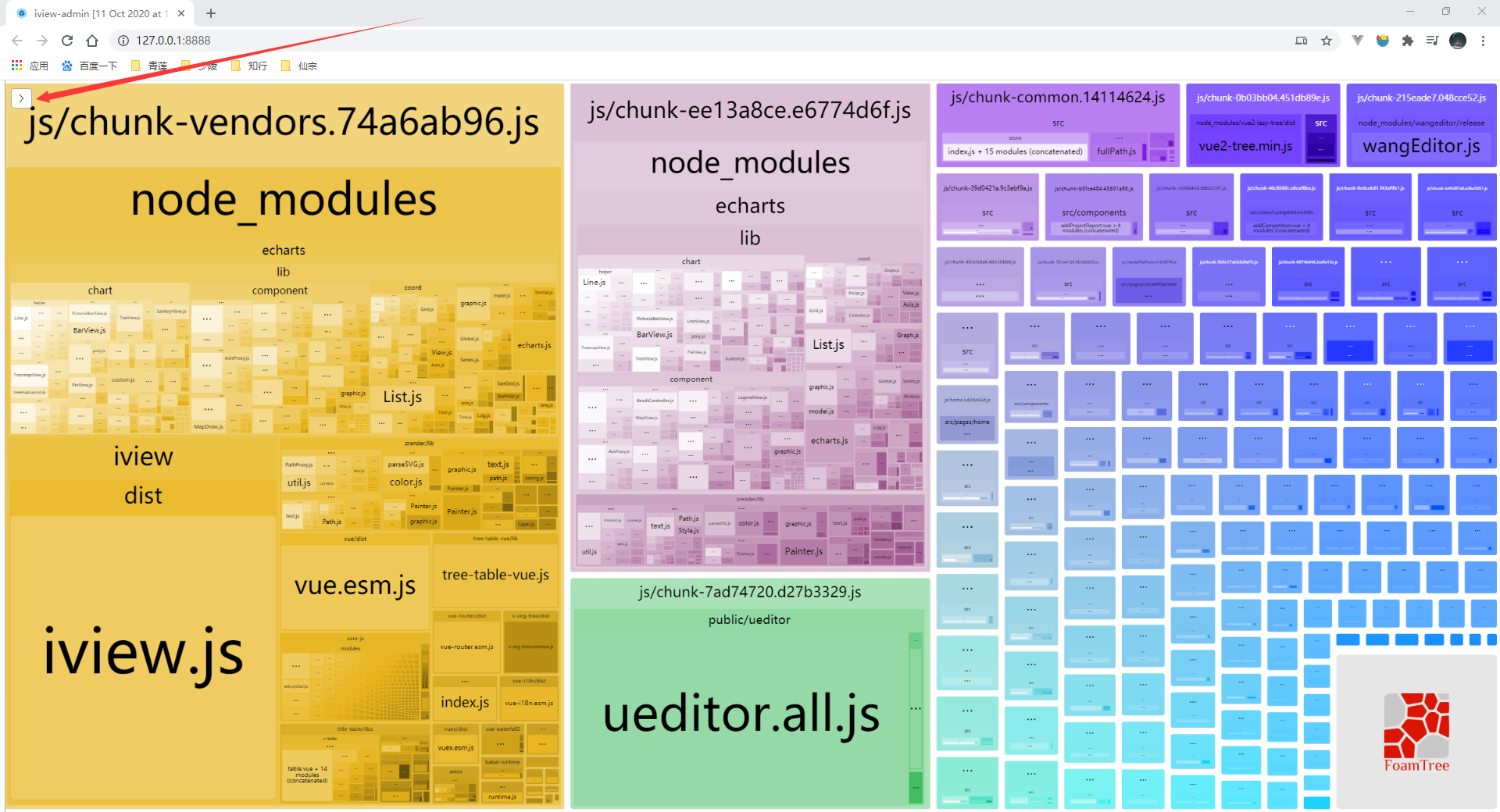 图中占面积越大的文件,其文件的大小越大,部署到服务器之后,在浏览器中加载的时间越长,点击左上角的像箭头一样的符号可以直接查看各个文件的大小。